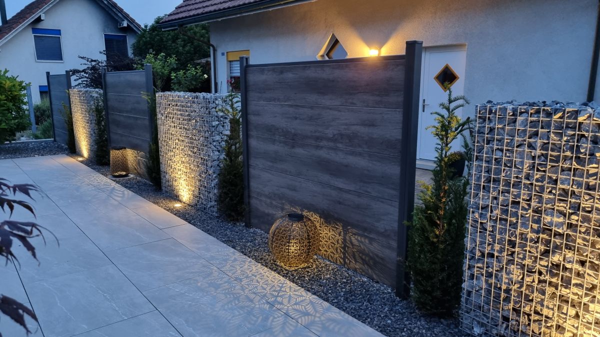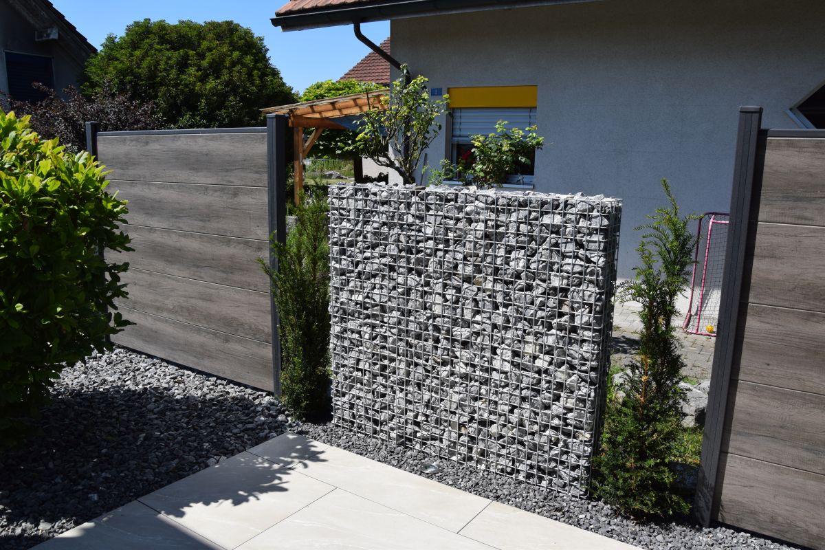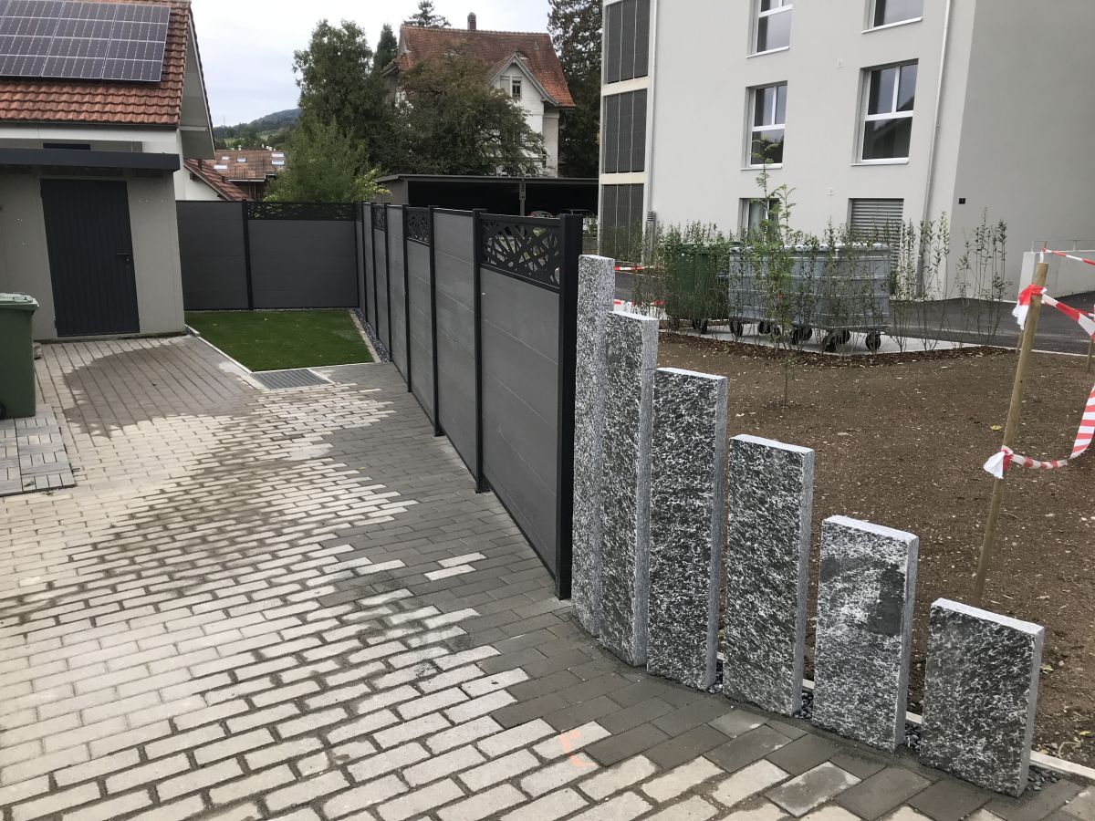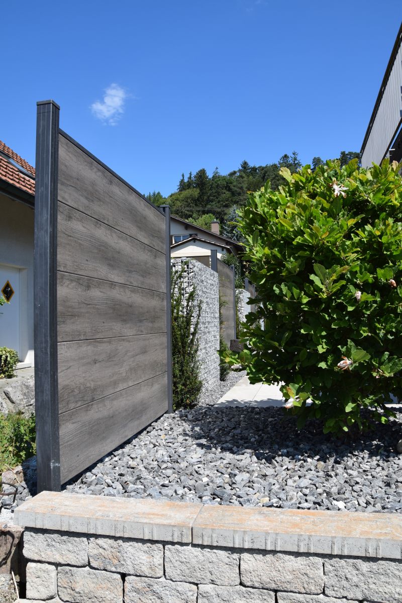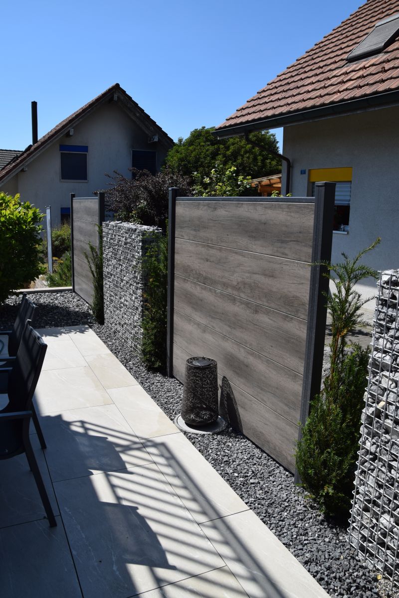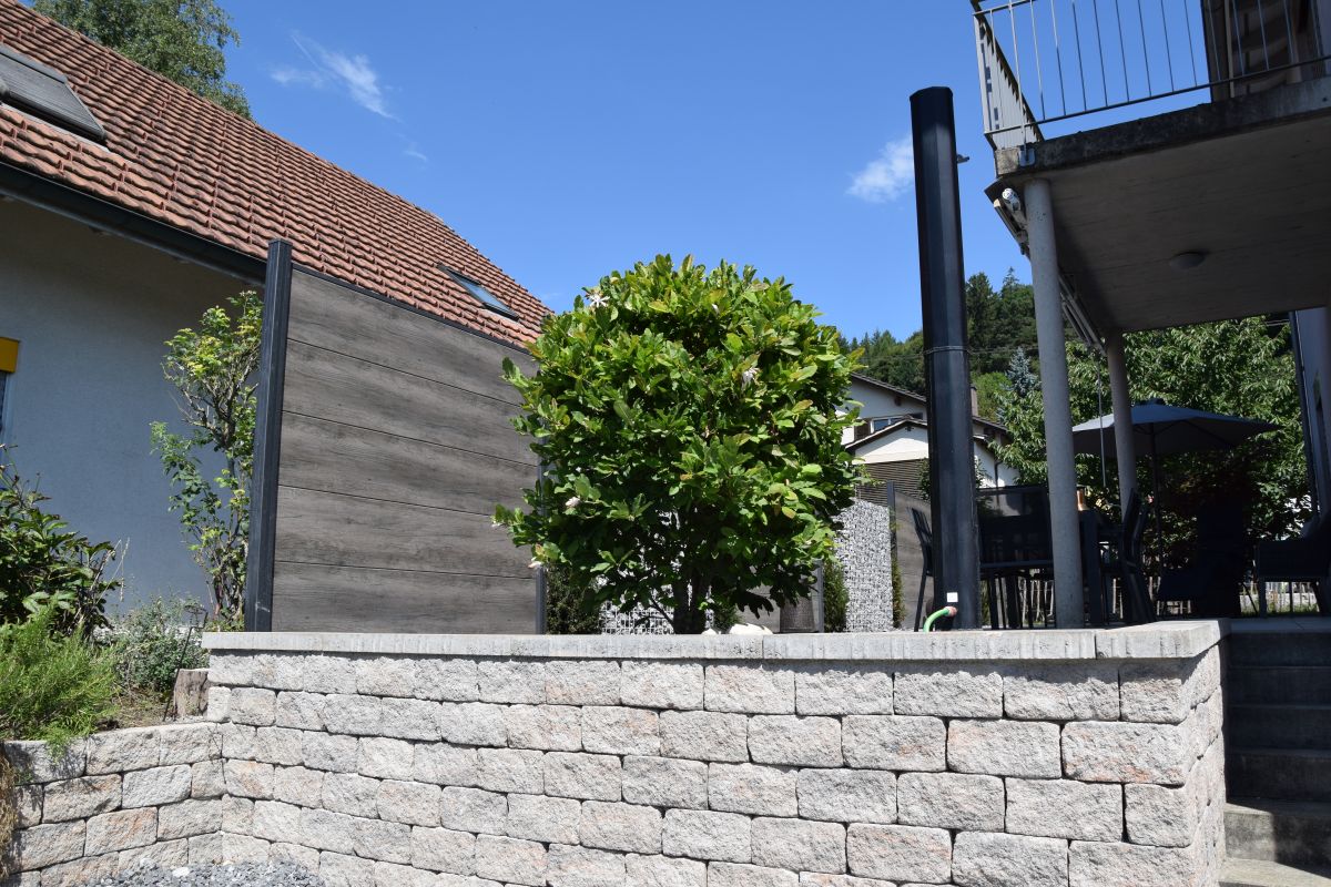 Sichtschutzwand WPC mit Steinrabatte und Rasenkantenabschluss