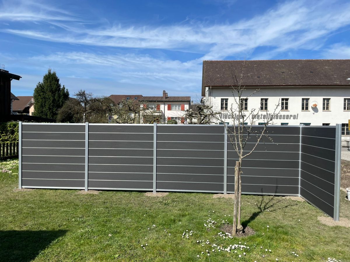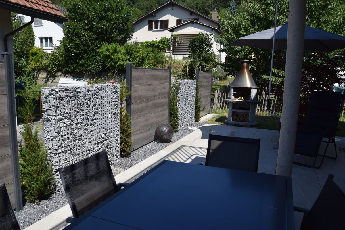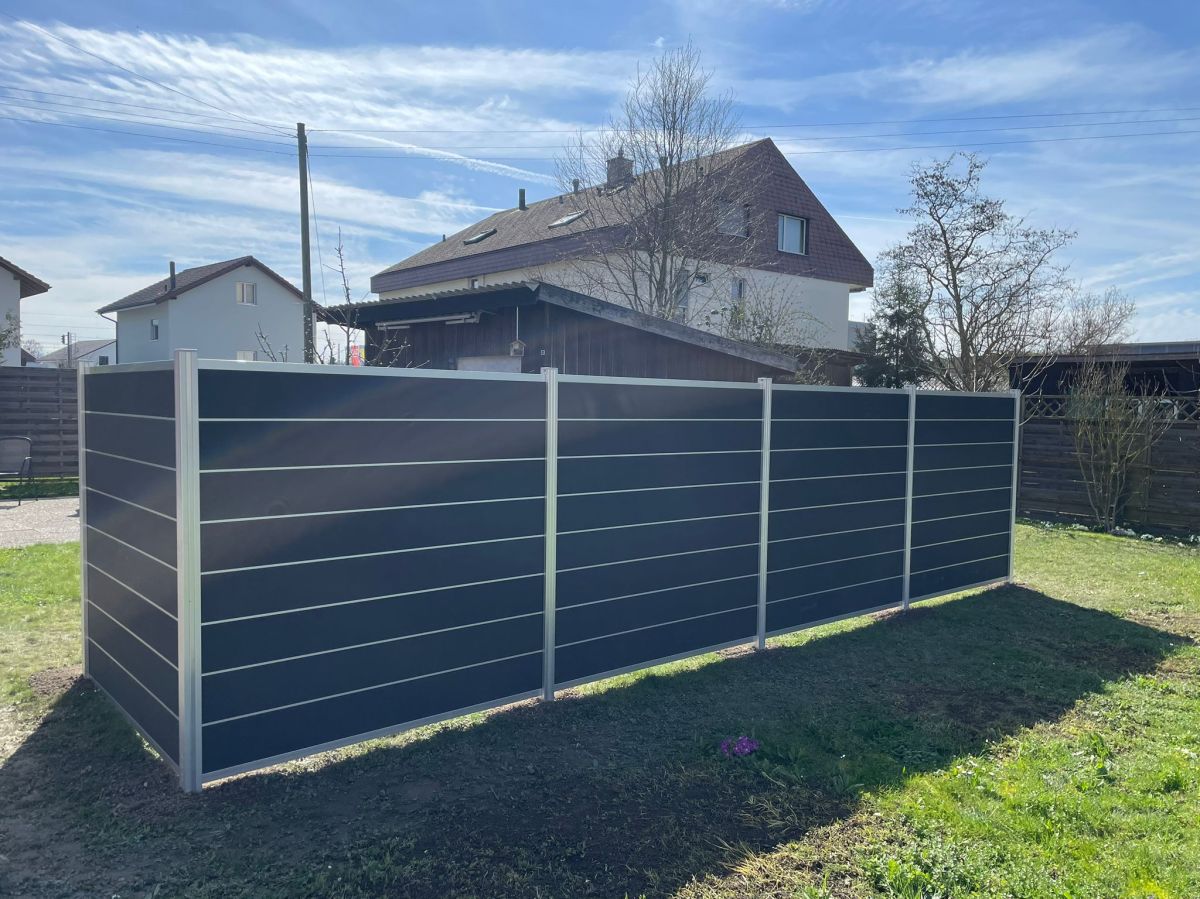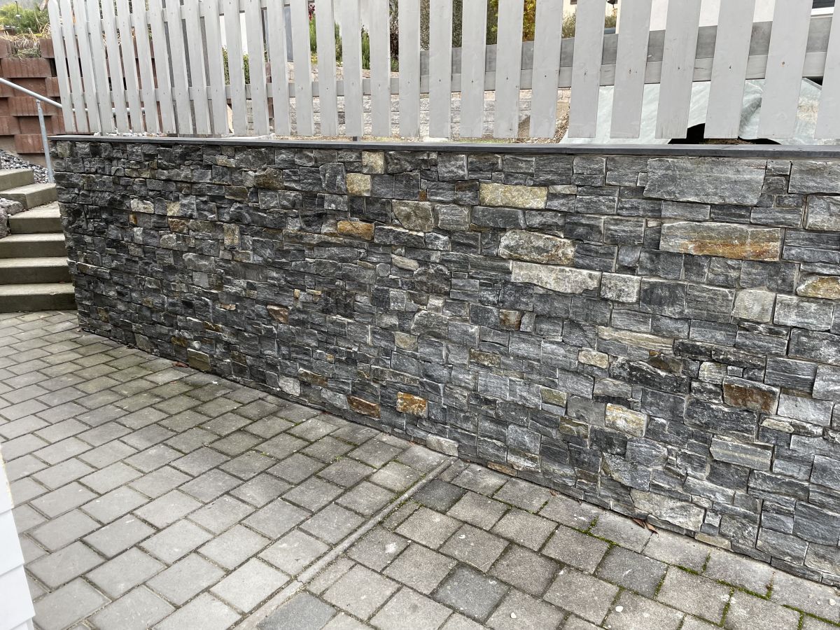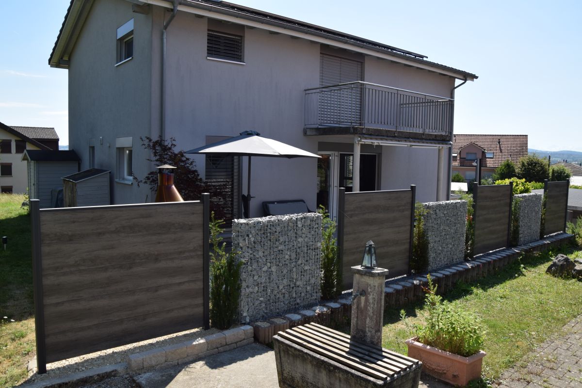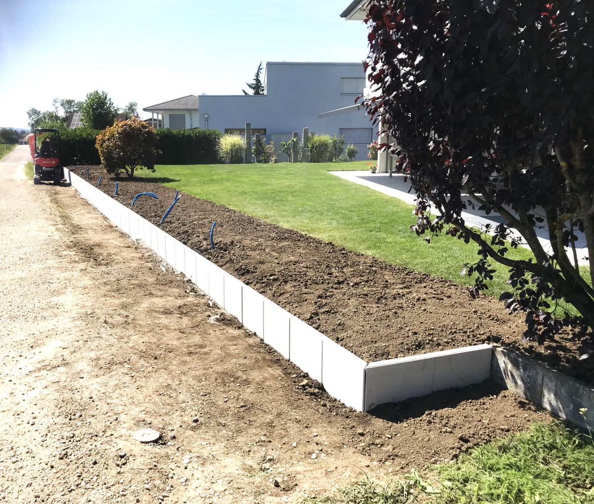 Sichtschutzwand WPC mit Steinrabatte und Rasenkantenabschluss